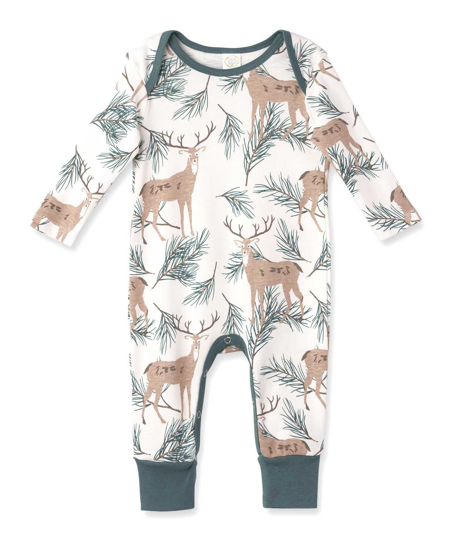 Baby Deer Pine Christmas romper in super soft bamboo/cotton/spandex blend jersey. Baby will look cute and feel comfy in our bamboo/cotton/spandex blend jersey. Envelope neck and snaps underneath make for easy on and off. Tesa Babe offers original boutique clothing and accessories for newborn, infant and toddler girls & boys. High quality and made with care, we provide a combination of soft & snuggly, fun & fabulous baby apparel.
