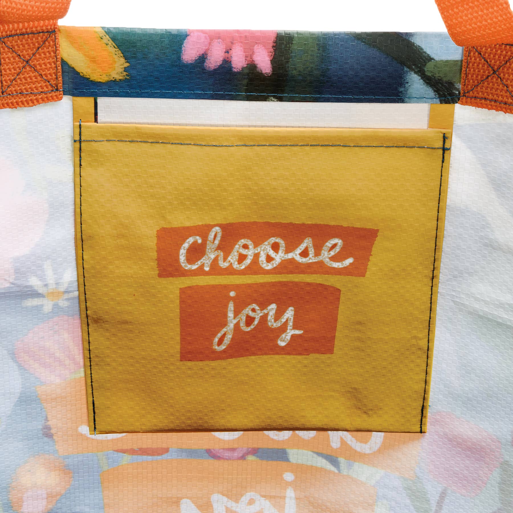 A double-sided shopping tote featuring an all-over vibrant floral design with "Choose Joy" sentiment. Contains interior pocket and dual nylon hand and shoulder straps. Made of post-consumer material.